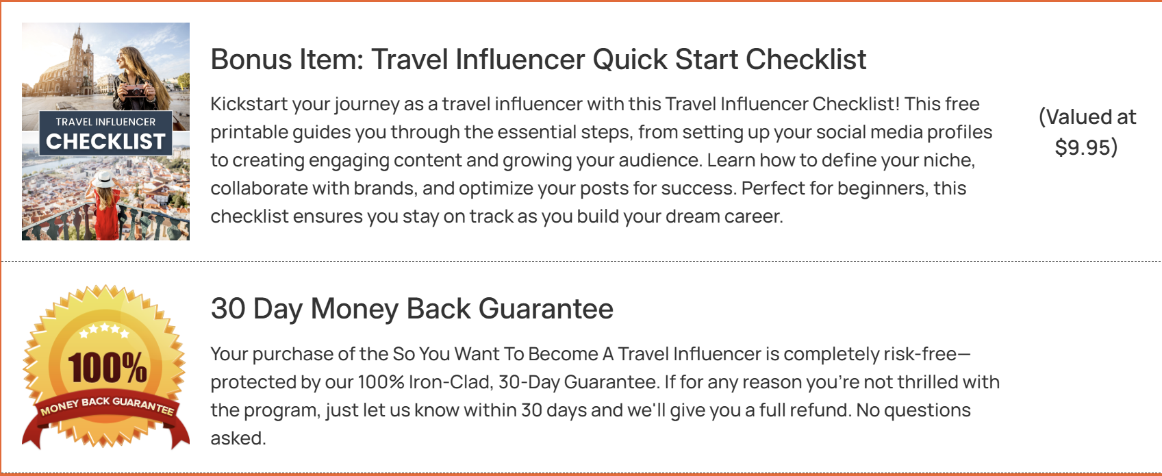 We're confident this program will transform your travel influencer journey. That's why we're offering a 30-day money-back guarantee. If you don't see results, simply let us know, and we'll refund your investment. You have nothing to lose and everything to gain.